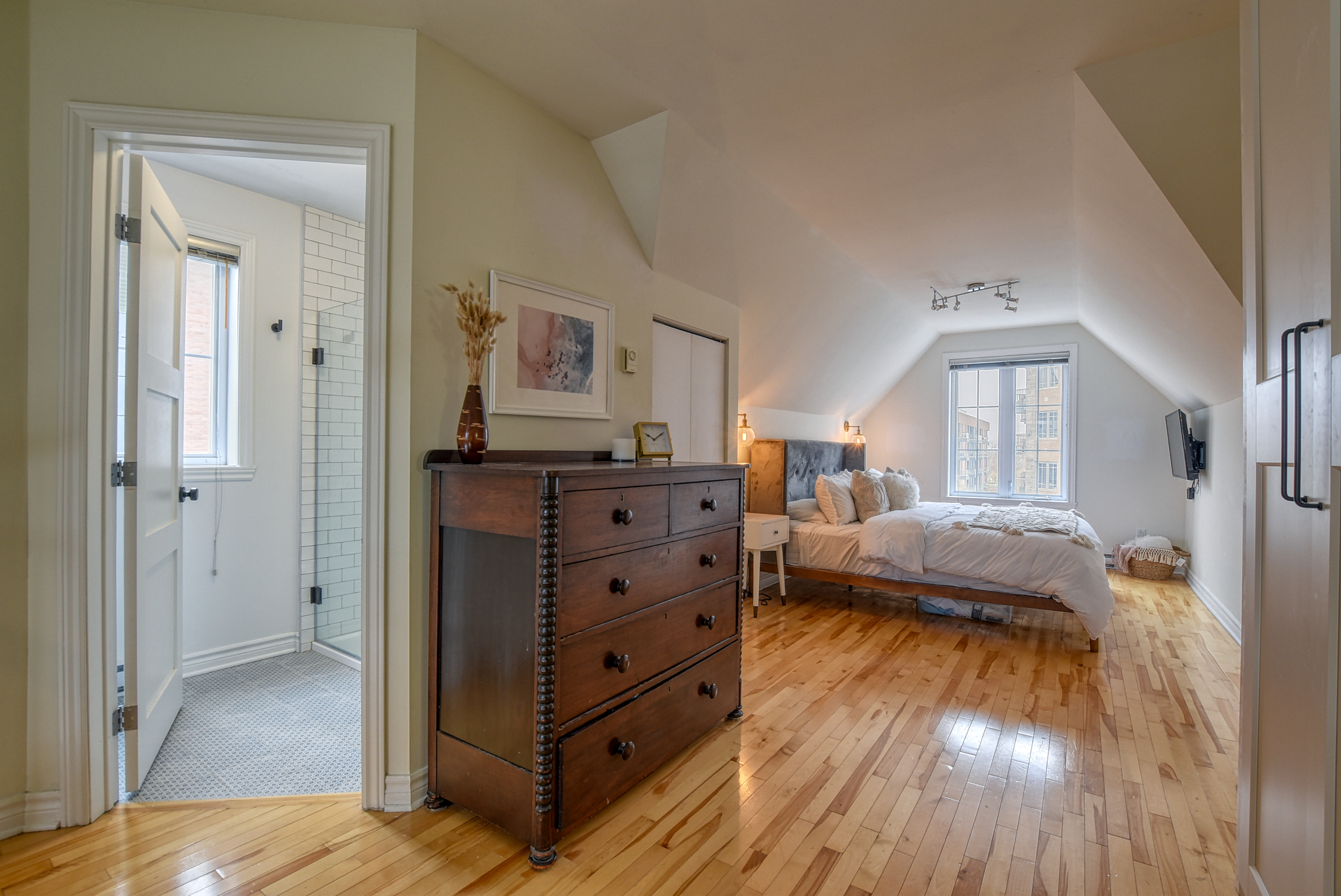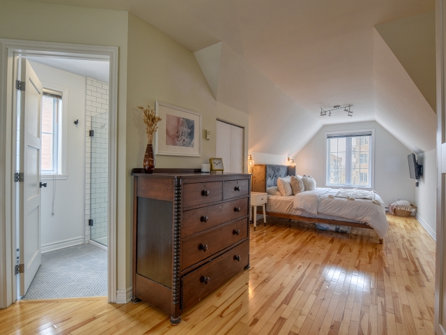 Voir plus Voir moinsCentral Bois-Franc Walk-up en brique rouge. Situé sur une rue en croissant au coeur de Bois-Franc. À quelques pas du centre ville avec ses boutiques et ses cafés. Cette unité au dernier étage offre une disposition unique. Transformé au moment de la construction d'un 2 chambres à coucher à un grand, 1,040 sqft - 1 chambre à coucher, 2 salles de bains complètes sur 2 étages. La cuisine a été étendue à l'arrière de la maison pour inclure un grand îlot, des armoires supplémentaires et un coin buanderie. La salle à manger et le salon sont des concepts ouverts avec une lumière naturelle ininterrompue grâce à des fenêtres enveloppantes et une fenêtre de toit à pignon. La hauteur du plafond est de plus de 16 pieds. Une salle de bain complète pour les invités avec baignoire trempée, mise à jour en 2020, est adjacente à la zone de vie principale. En montant les escaliers vers les quartiers de vie du maître. Une ligne de toit confortable avec une mezzanine ouverte donnant sur l'étage inférieur. Ancrant le lit king size, 2 appliques murales dorées. A côté se trouve un coin lecture. Enfin, une salle de bain privée en-suite complète le logement principal. Rénovée en 2020 avec une douche moderne en verre noir et blanc et des carreaux artisanaux. Étant le dernier étage, le balcon extérieur a des vues sur la ligne de ville de Bois-Franc. L'exposition au soleil est nord avec une croix est-ouest. Ce qui permet de profiter du soleil toute la journée pour bronzer et recevoir en plein air. Un garage privé fermé pour vous seul. Gardez les pneus, les articles de sport et un SUV, pas de problème. Les couleurs de l'unité sont des tons de bois naturel, mélangés avec de l'or brossé et des accents sombres.
